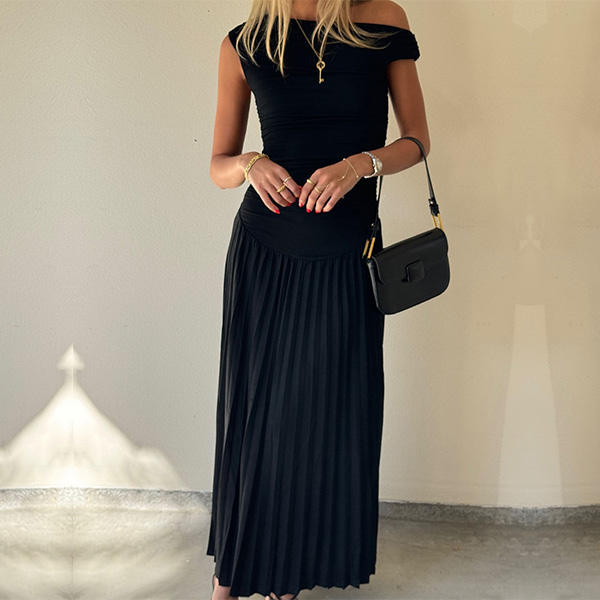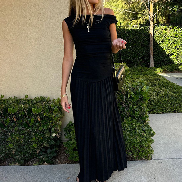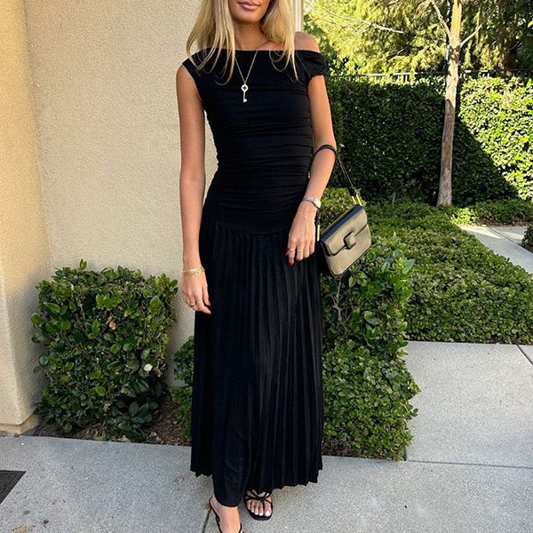 Fashion Strapless Cap Sleeveless Pleated Maxi Dress