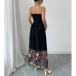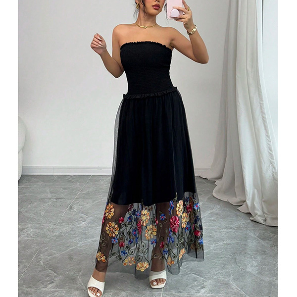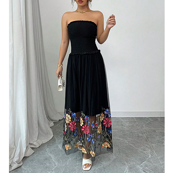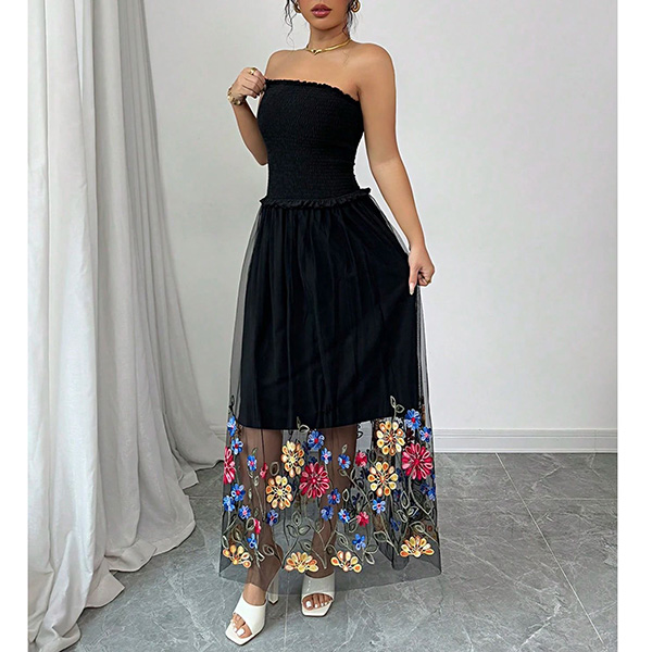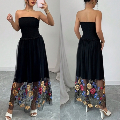 Fashion Strapless High-rise Floral Embroidered Gauze Spliced Maxi Dress