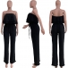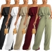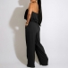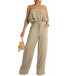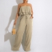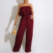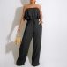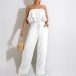 This fashion-forward jumpsuit features strapless silhouette with a playful, ruffled bodice and a relaxed, wide-leg silhouette, creating a stylish and eye-catching look that is perfect for a variety of chic, warm-weather occasions.