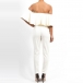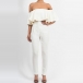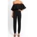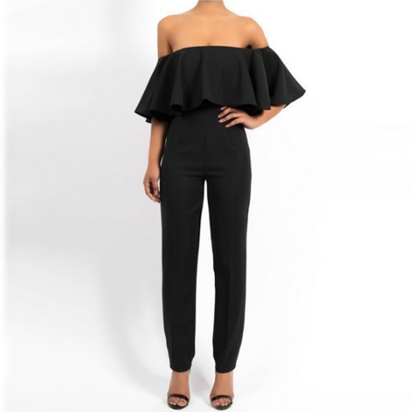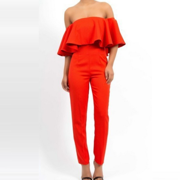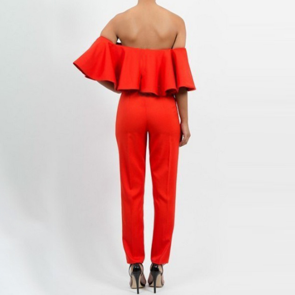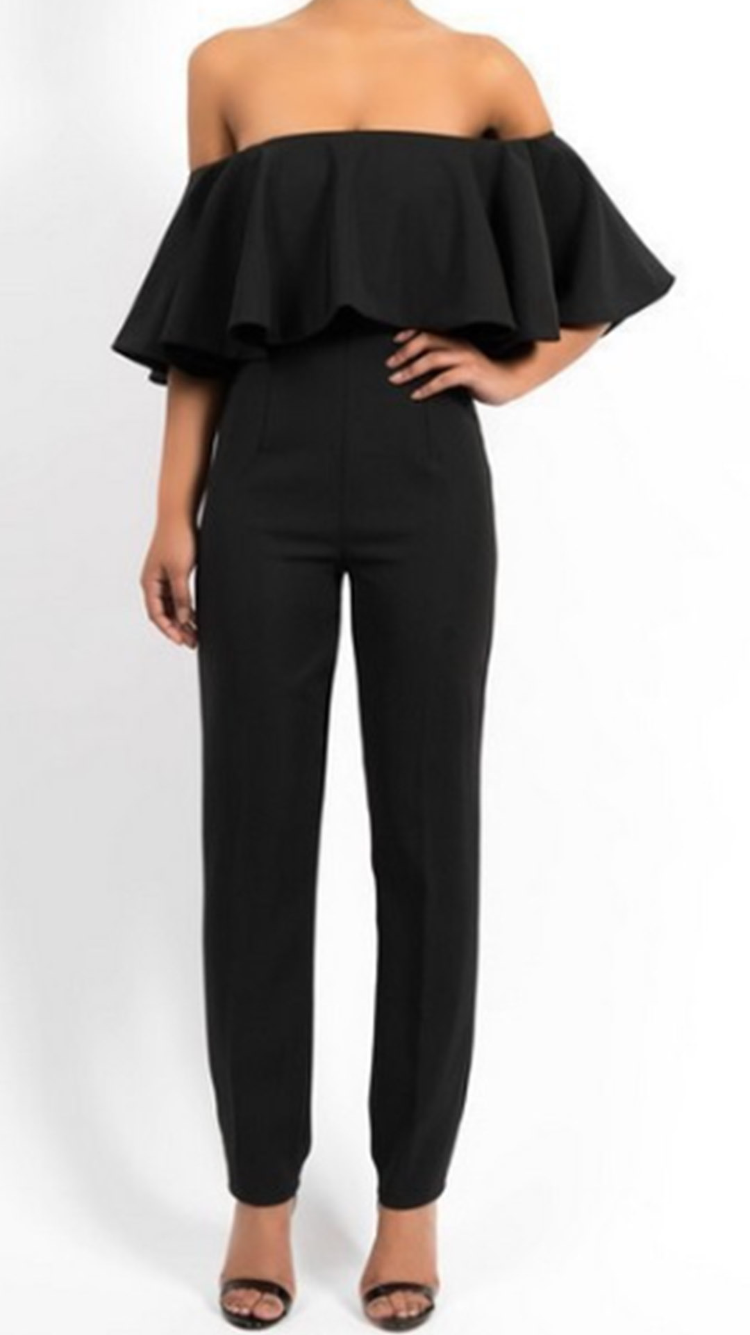 This jumpsuit features a strapless neckline with ruffle detailing, a fitted bodice for a chic and fashion-forward look.