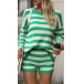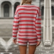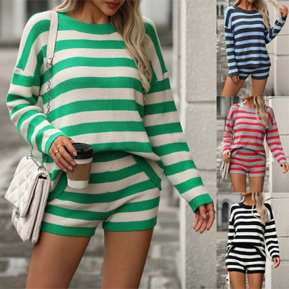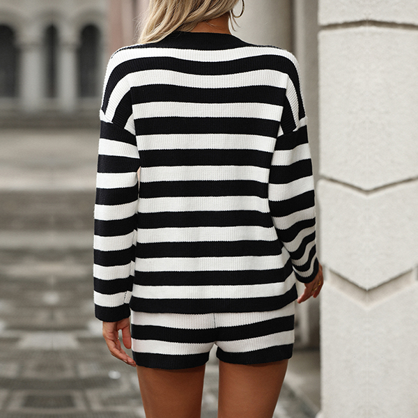 Fashion Stripe Pattern Knitted Two-piece Set Consist of Long Sleeve Sweater and Knitted Shorts