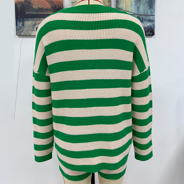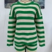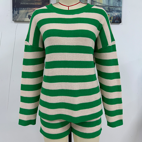This trendy two-piece set features a stripe pattern and consists of a long sleeve sweater and knitted shorts, creating a chic and coordinated look. And the knitted fabric adds texture and warmth. Whether you're lounging at home, running errands, or meeting friends for a casual outing, this two-piece set is a fashionable and on-trend choice. Hope you like it.