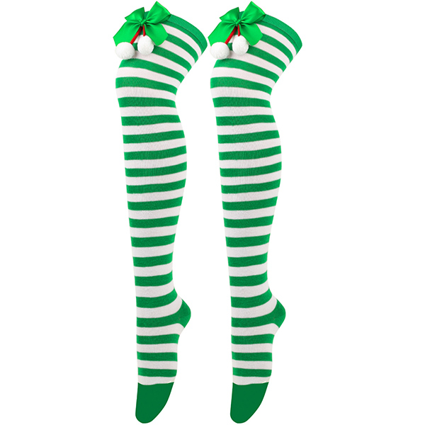 These festive and stylish Christmas knee socks are perfect for the holiday season! They feature a stripe print with a bowknot and pom-pom detail. They are sure to add some holiday cheer to any outfit!