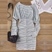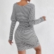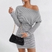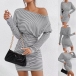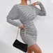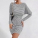 Fashion Stripe Printed Round Neck Long Sleeve Cinch Waist Bodycon Dress