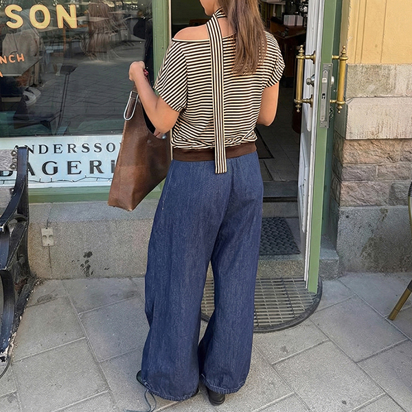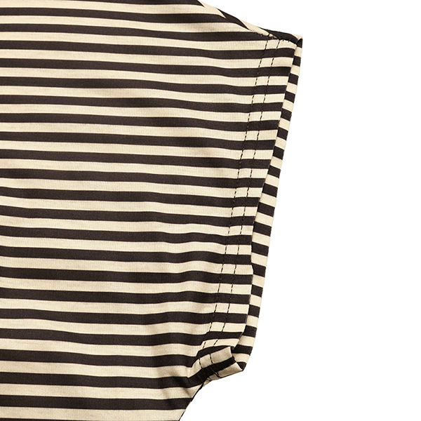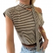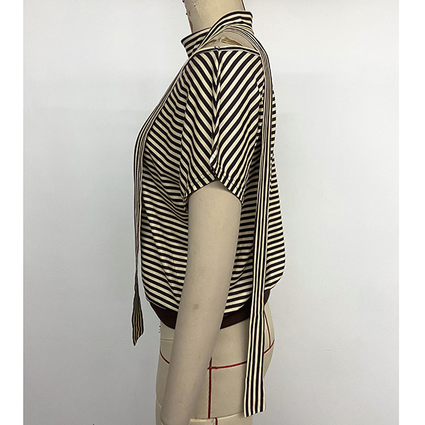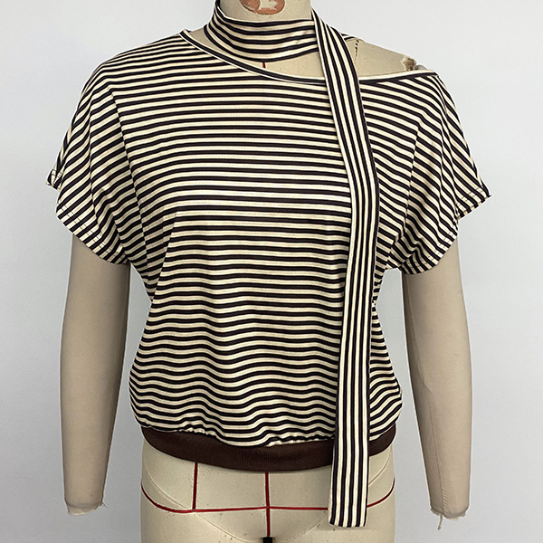 Fashion Stripe Printed Slant Shoulder Short Sleeve Shirt with Scarf