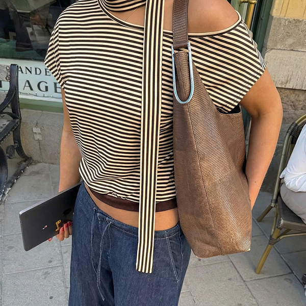Turn heads with this uniquely designed shirt that brings architectural drama to everyday style. Bold stripe printing creates graphic interest and dynamic visual appeal, while an unexpected slant shoulder design adds contemporary edge and asymmetrical intrigue. Pair with high-waisted jeans and sneakers for effortless cool, or style with tailored trousers and loafers for elevated casual sophistication.