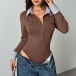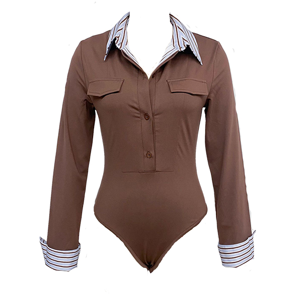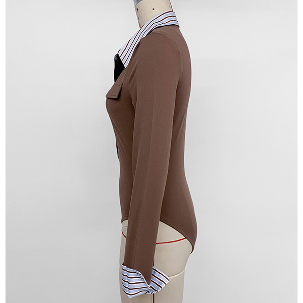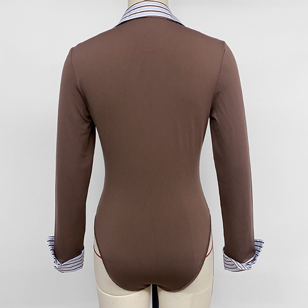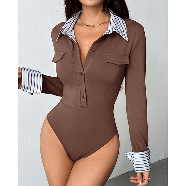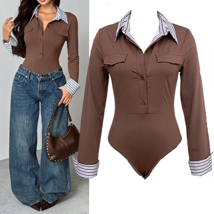 Fashion Stripe Printed Spliced Lapel Collar Button V-neck Long Sleeve Bodysuit