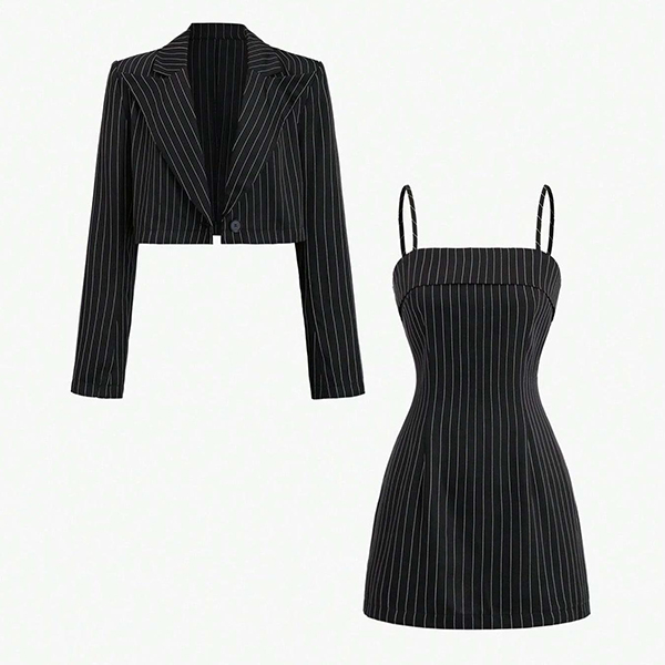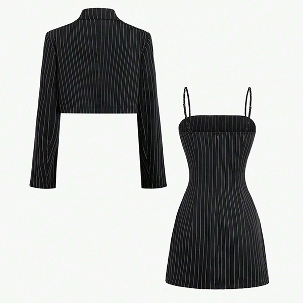 This coordinated two-piece set features structured crop blazer paired with figure-flattering bodycon dress in matching stripe print for contemporary professional sophistication. Perfect for professional occasions, contemporary events, or sophisticated coordinated styling.
