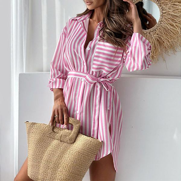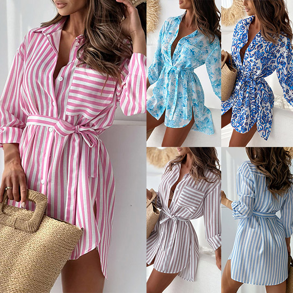 This shirt dress features a stripe or floral print, long sleeves, and a self-tie waist belt, creating a versatile and chic look. The stripe or floral print which one do you like?