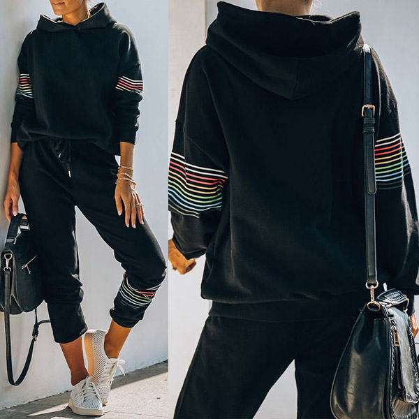 Fashion Striped Spliced Long Sleeve Hooded Sweatshirt + Pants Two-piece Set