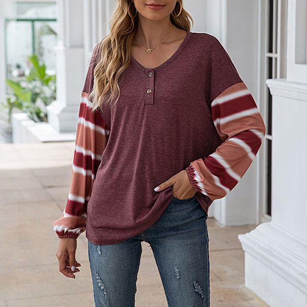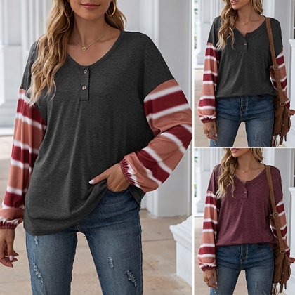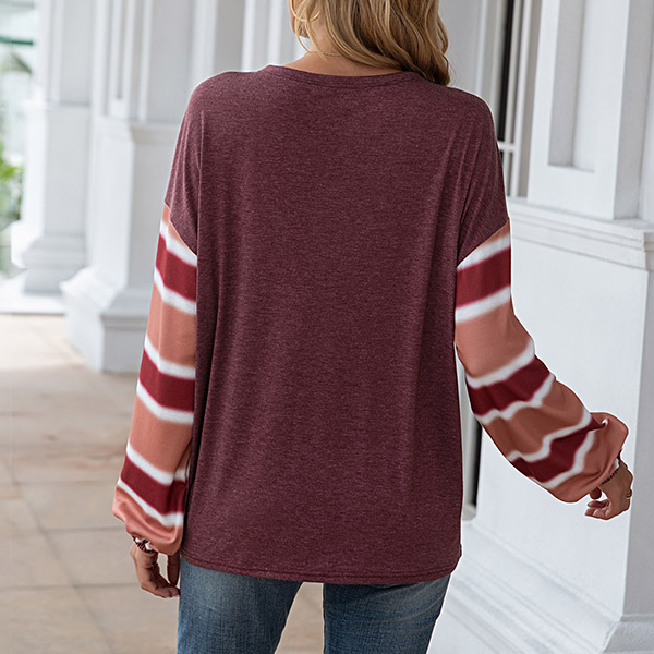 Fashion Striped Spliced Long Sleeve Round Neck T-shirt