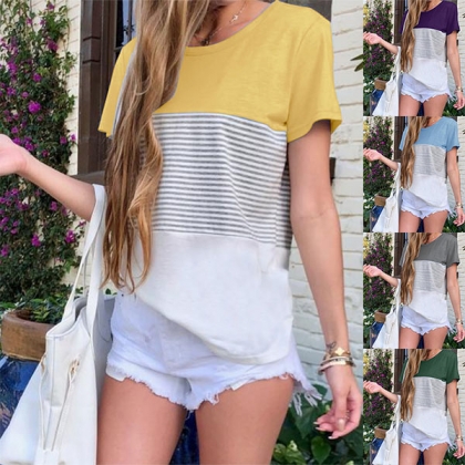 Fashion Striped Spliced Short Sleeve Round Neck Contrast Color T-shirt