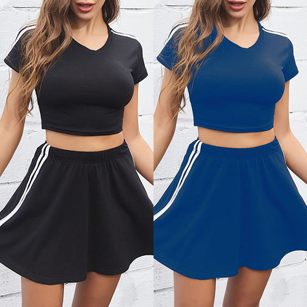 Even during your sports time,you can showcase your style and charming feminine appeal with this two-piece set. The striped spliced design breaks the simple and dull design style. Including a short sleeve v-neck t-shirt and a high waist skirt,this two-piece set is perfect fit for your sports time and casual weekends.
