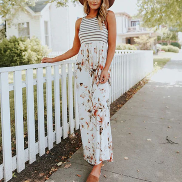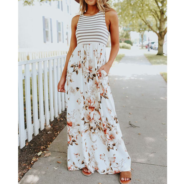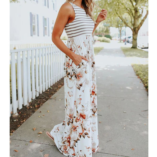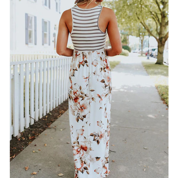 Fashion Striped Spliced Sleeveless Round Neck Printed Maxi Dress