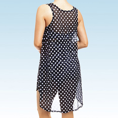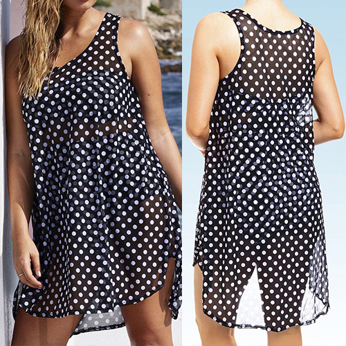 This piece of bikini cover-up is thoroughly decorated with polka dots , which is fashion and beautiful.