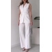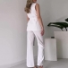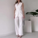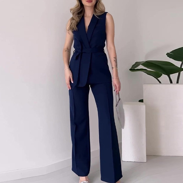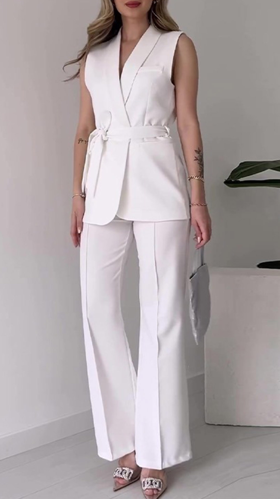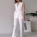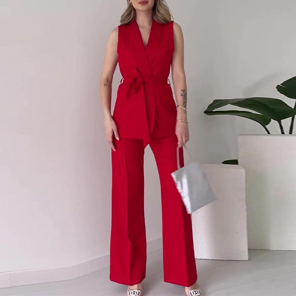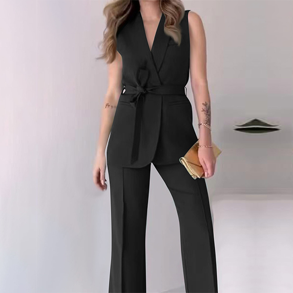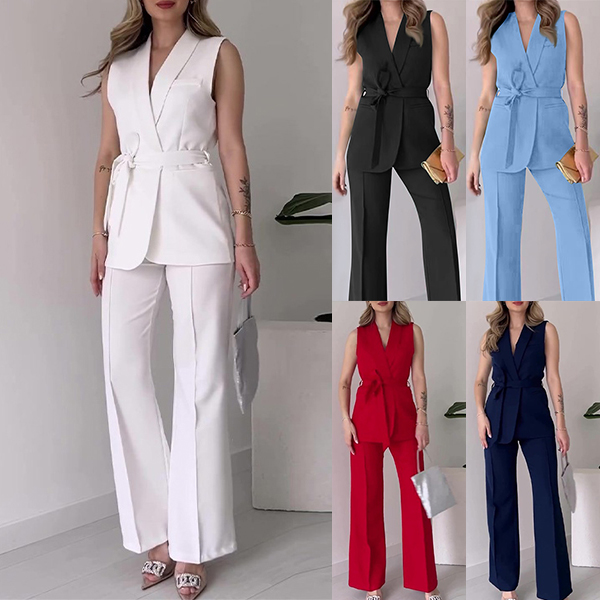 This fashionable two-piece set consists of a self-tie vest and straight-cut pants, creating a sophisticated and stylish look. The self-tie vest features a wrap-around design with a tie closure, adding a chic and tailored touch to the ensemble. The straight-cut pants offer a classic and versatile silhouette. Wanna have a try?