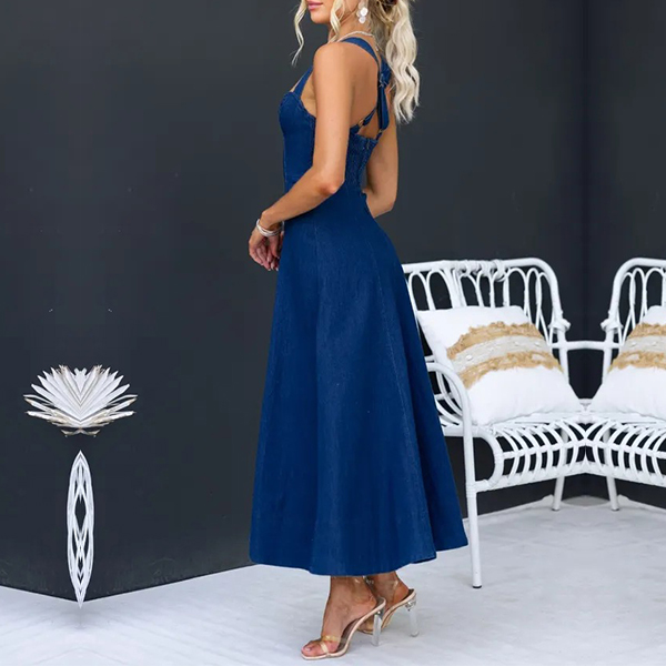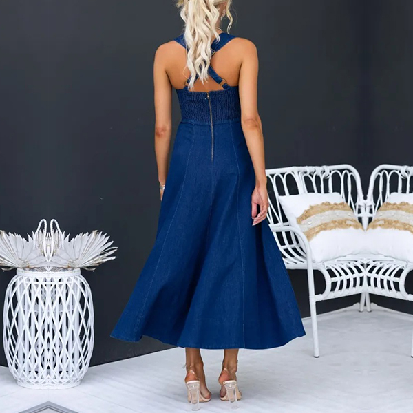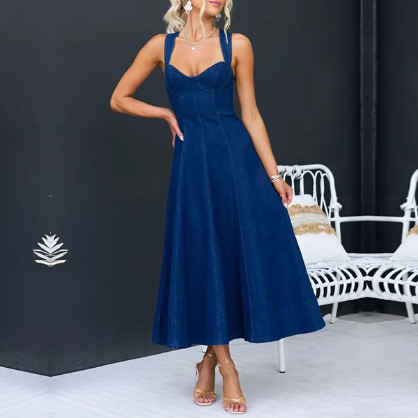 Look at this denim dress! The sweetheart neckline adds a flattering touch, while the cross backless detailing adds a hint of allure and adds visual interest to the dress. Pair it with heels or ankle boots for a chic and elevated ensemble.