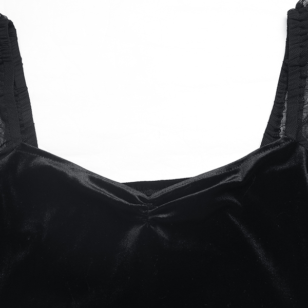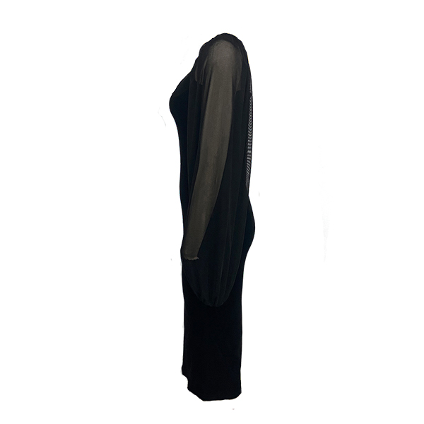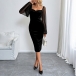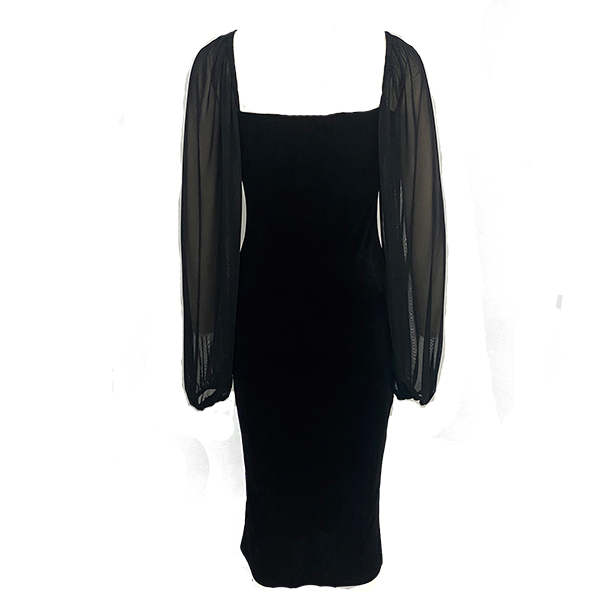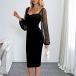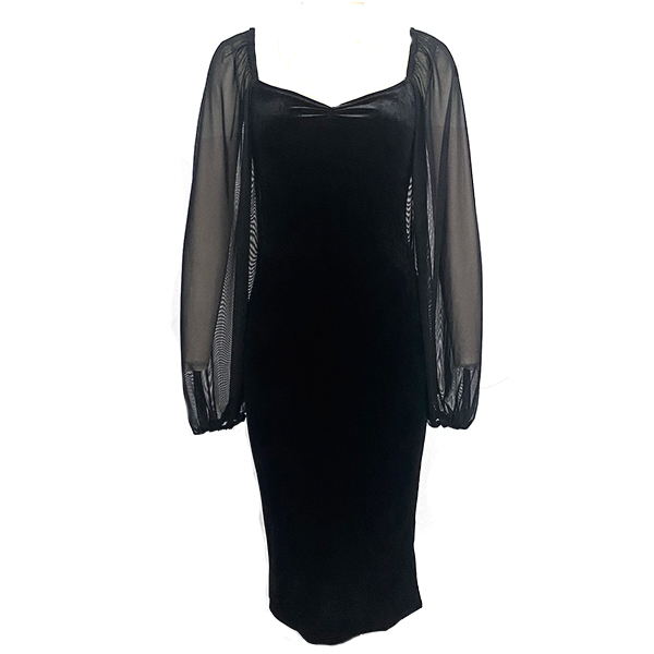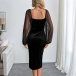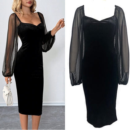 Fashion Sweetheart Neckline Gauze Spliced Puff Long Sleeve Bodycon Velvet Dress