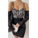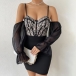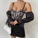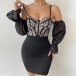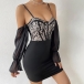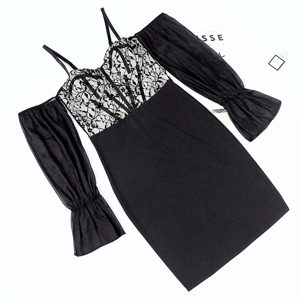Fashion Sweetheart Neckline Lace Spliced Bodice Gauze Spliced Open-shoulder Trumpet Long Sleeve Slip Bodycon Dress