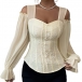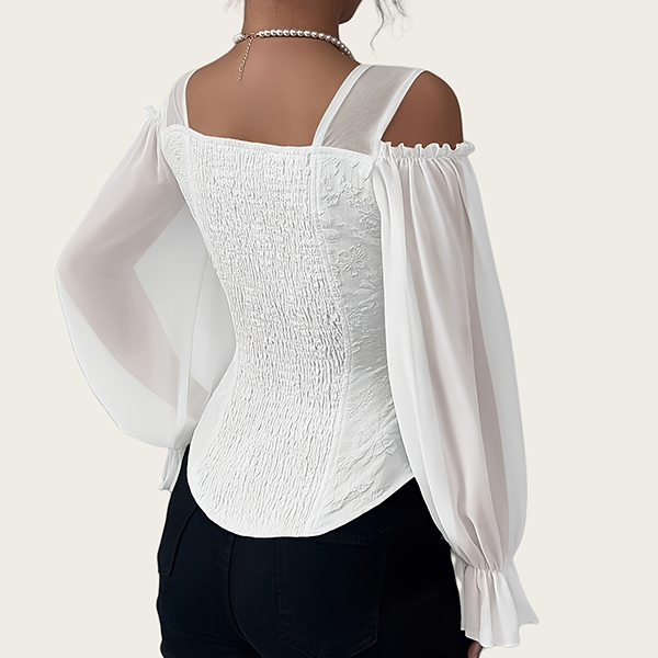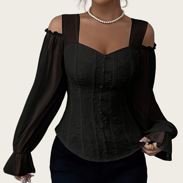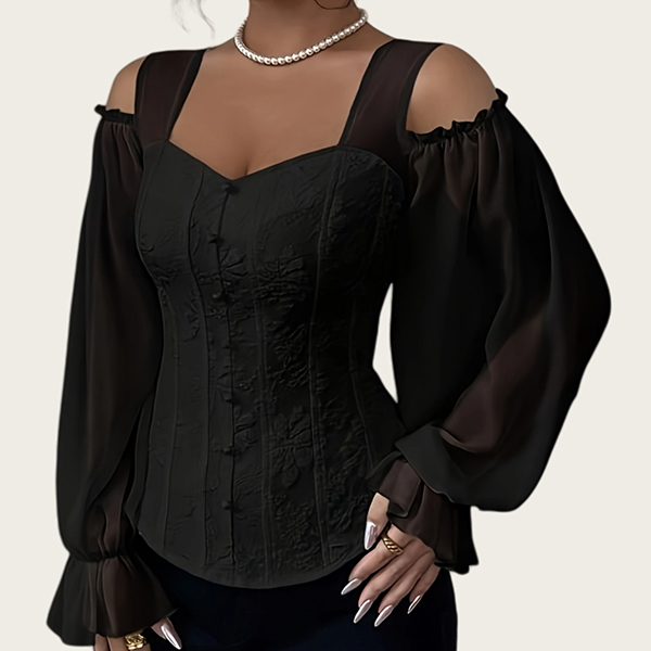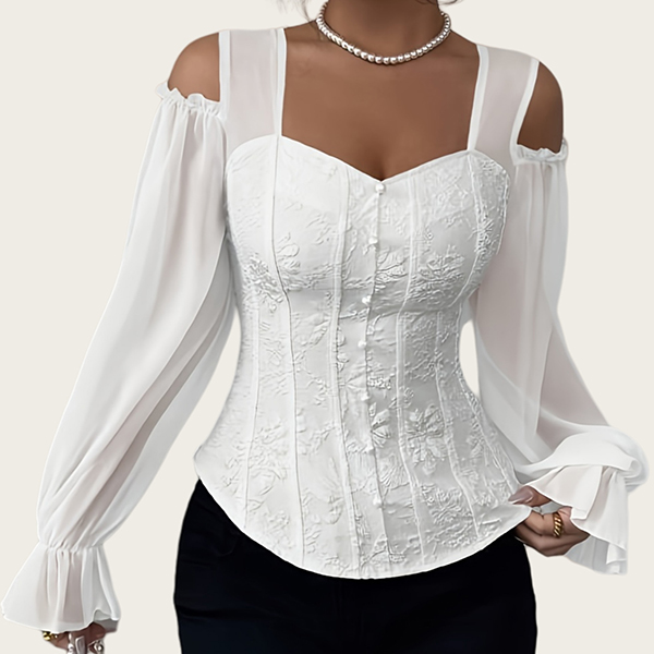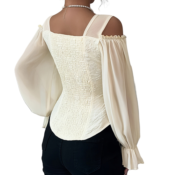 Fashion Sweetheart Neckline Open-shoulder Gauze Spliced Long Sleeve Jacquard Shirt