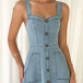 Fashion Sweetheart Neckline Patch Pockets Front Button Backless Old-washed Denim Dress