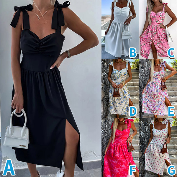 This captivating dress features a flattering sweetheart neckline, self-tie shoulder straps, and a dramatic thigh-high slit, creating a sophisticated and alluring silhouette. Multi-colors avabile.