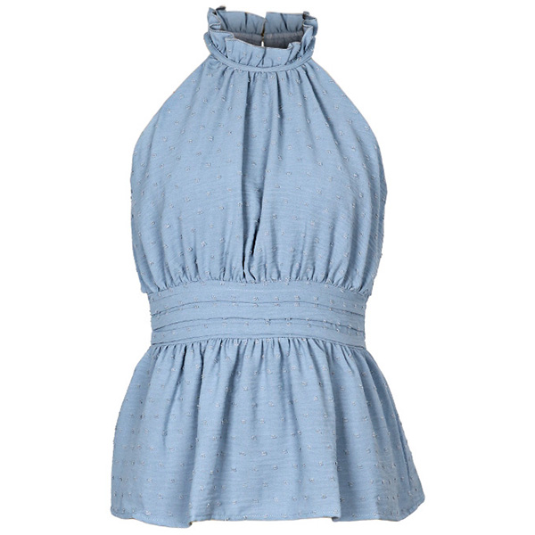 This shirt features a Swiss-dot fabric, mock neck, sleeveless silhouette, and self-tie waist detail for a fashionable and trendy look.