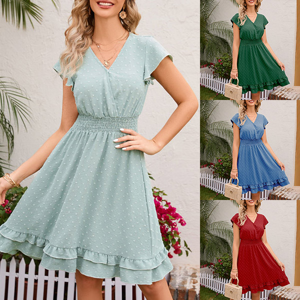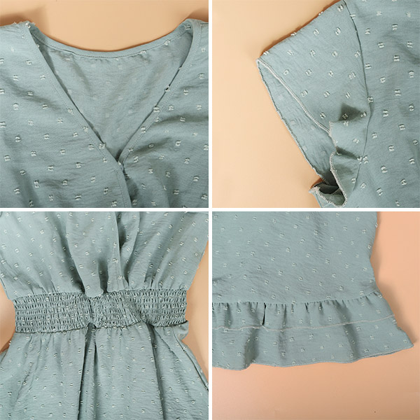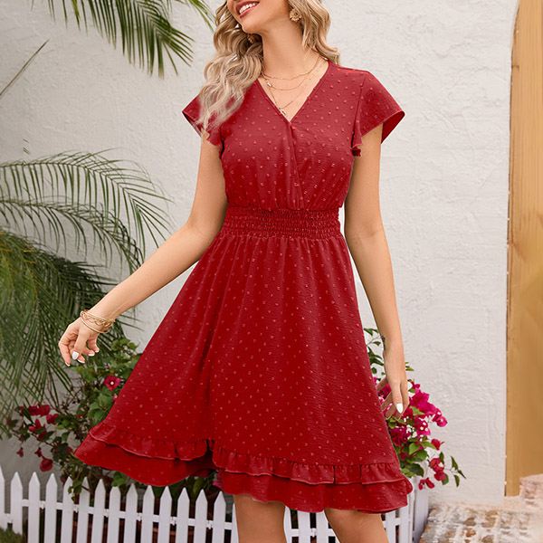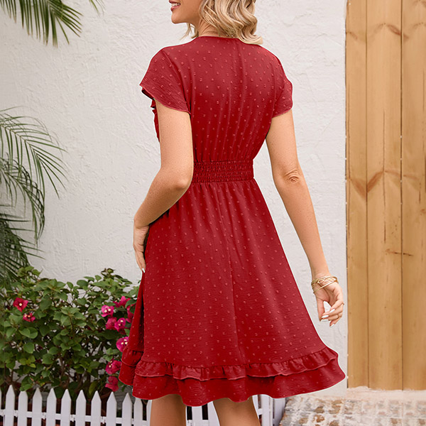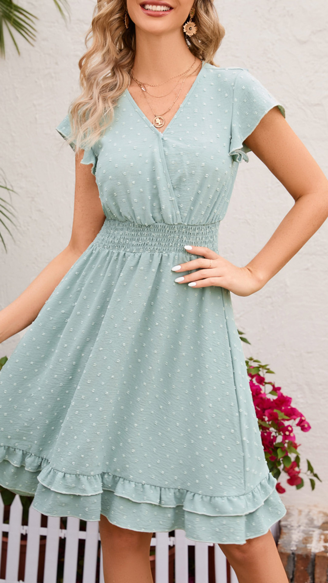 This mini dress features Swiss-dot fabirc, V-neckline, short sleeves, and a smocked cinched waist for a chic and fashionable look.