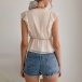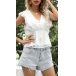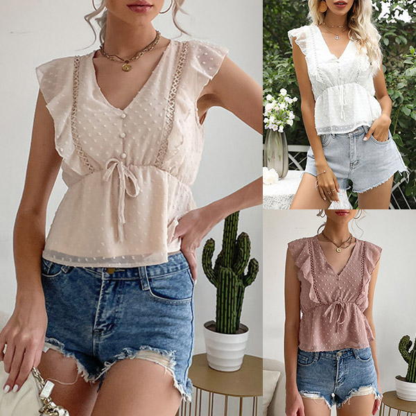 This shirt features a swiss-dot fabric with a V-neckline, front ruffled details, and a sleeveless silhouette and cinch waist for a fashionable and chic look. Pair it with jeans or shorts for a casual and chic ensemble.