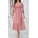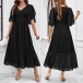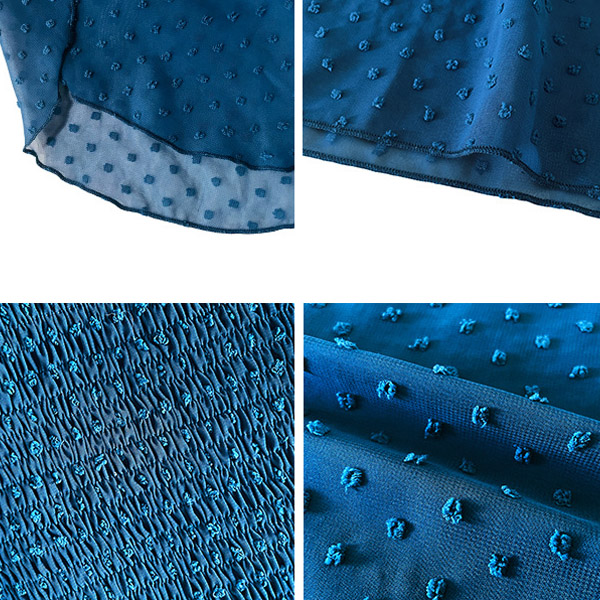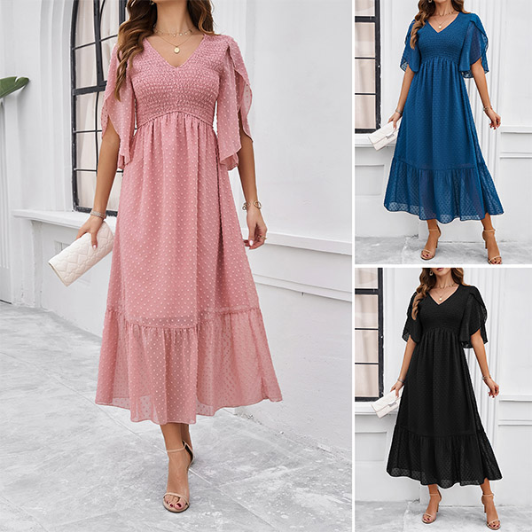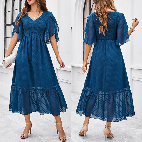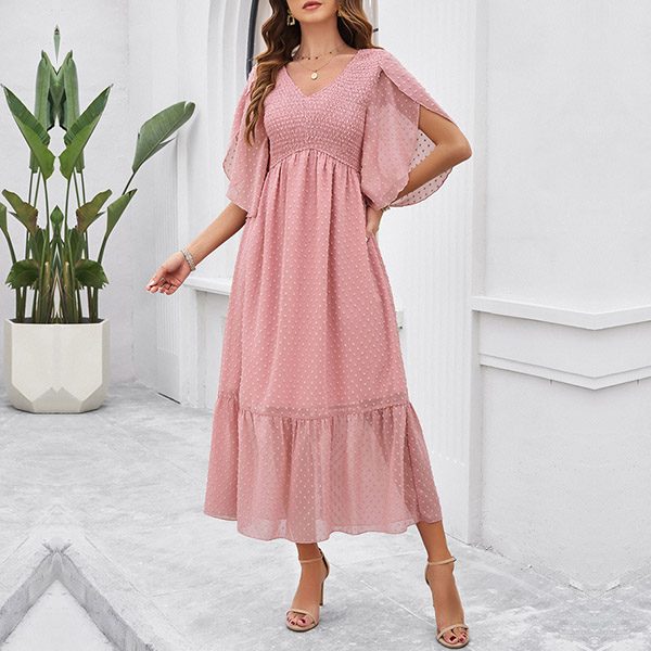 This charming dress features a delicate Swiss-dot pattern, smocked bodice for a perfect fit. It has a flattering V-neckline, short sleeves, a high-rise waist, and a midi length, offering a feminine and sophisticated look for various occasions. Wanna have a try?