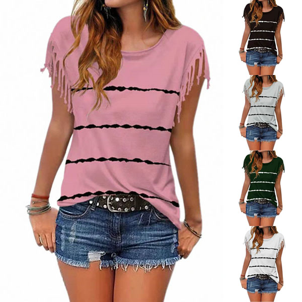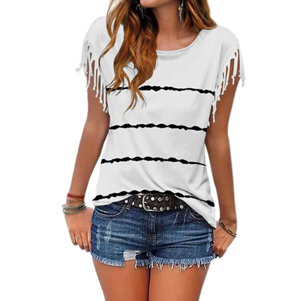 Fashion Tassel Short Sleeve Round Neck Striped Printed T-shirt