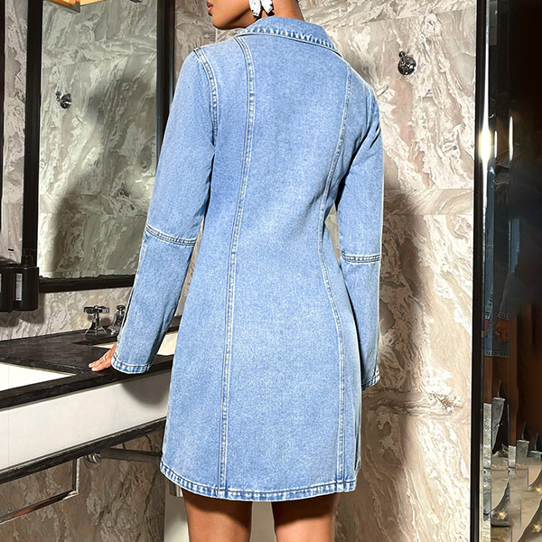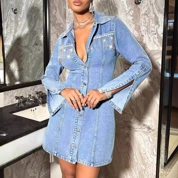 This denim dress features a stand collar, slit long sleeves, front button closure, tassel design along the chest and an old-washed denim finish, creating a fashion-forward and trendy look. Pair it with ankle boots or heels for a stylish and on-trend look, or style it with sneakers for a more casual and laid-back ensemble.