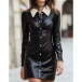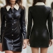 Fashion Thin Plush Lined Stand Collar Long Sleeve Front Button Artificial Leather PU Bodycon Shirt Dress