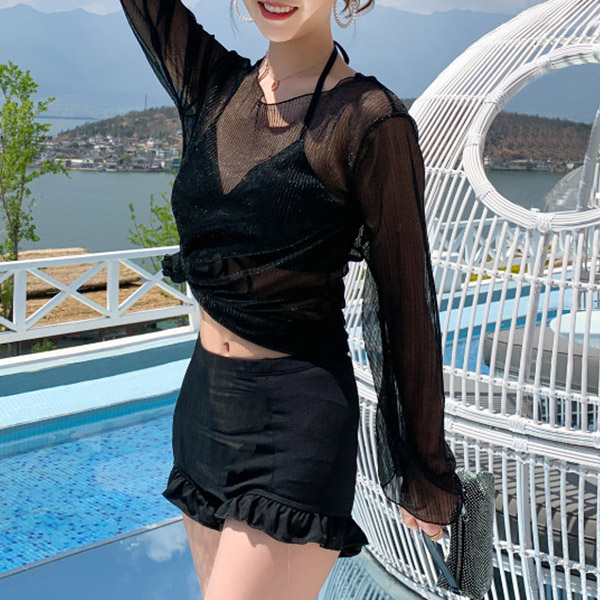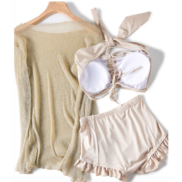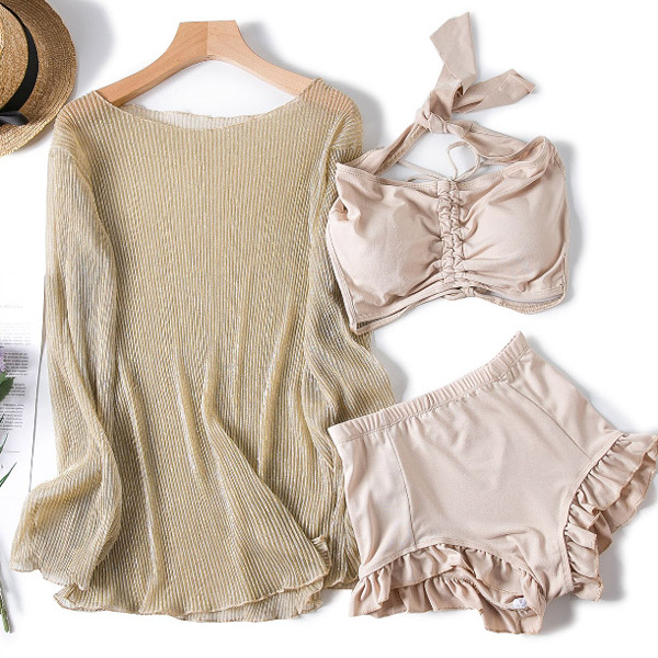 Fashion Three-piece Swimsuit Consist of Swimming Cover-up Shirt, Swimming Bra and Ruffled Swimming Bottom