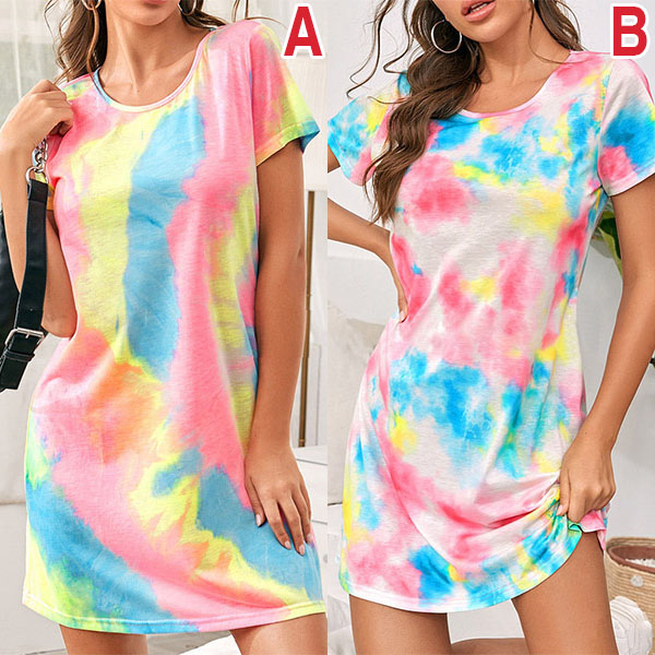 Your simple and dull wardrobe would be more colorful by adding this t-shirt dress. The tie-dye printed details make this piece look so eye-catching and stylish. Finished with short sleeve and round neck design,this dress can offer you a cozy yet stylish style.