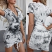 Fashion Tie-dye Printed Short Sleeve V-neck Slim Fit Drawstring Waist