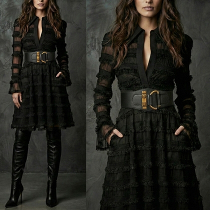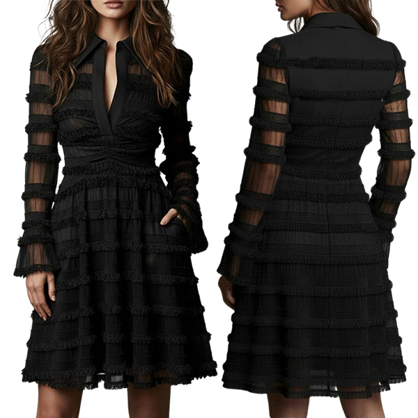 This black dress features dynamic tiered styling with sophisticated ruffle texture construction and elegant deep V-neck design for modern dimensional sophistication. Whilst the side pockets offer practical functionality and casual refinement. Wanna have a try?