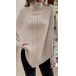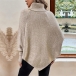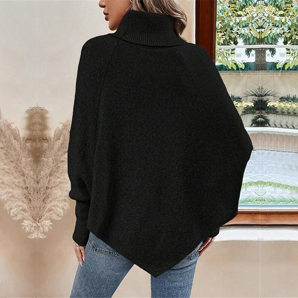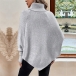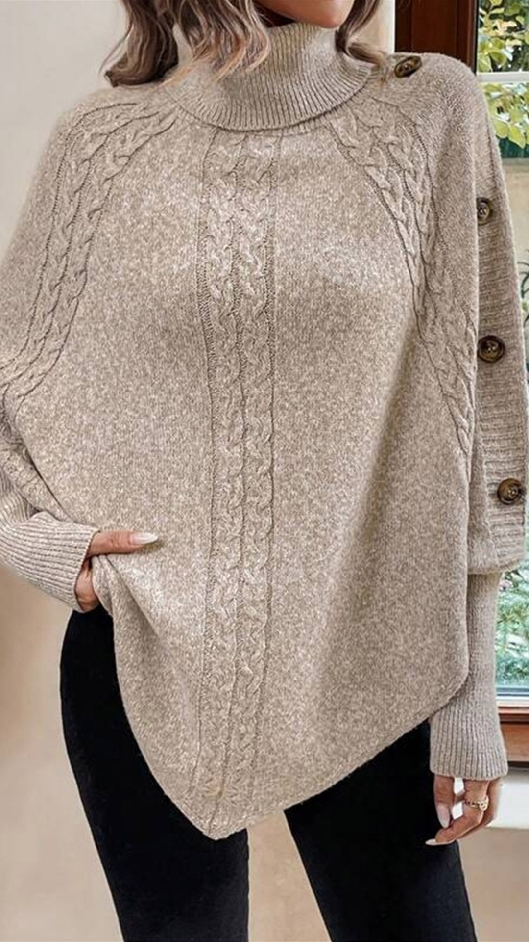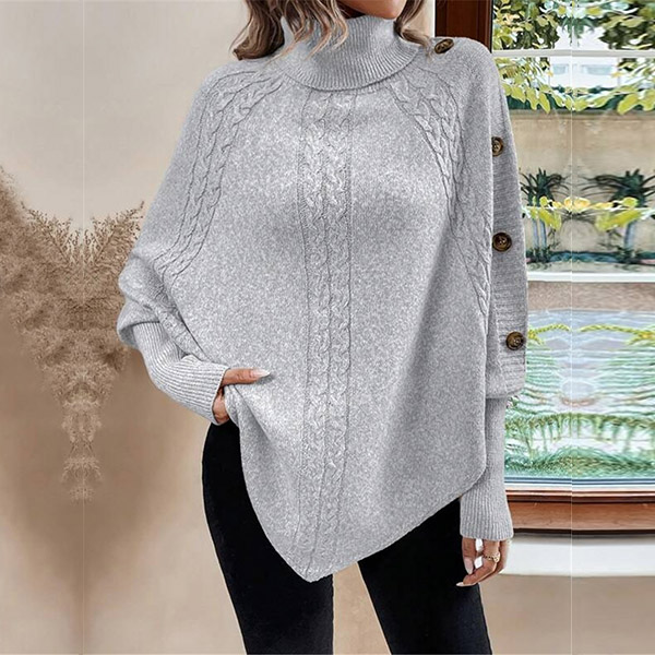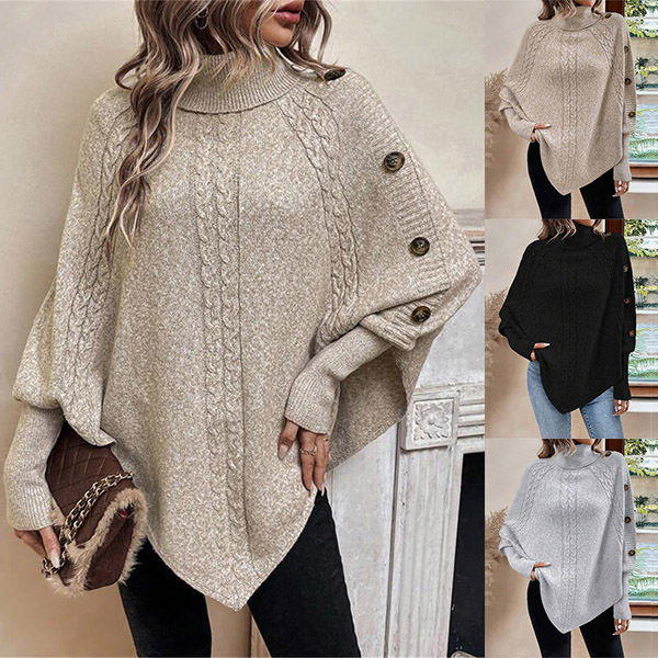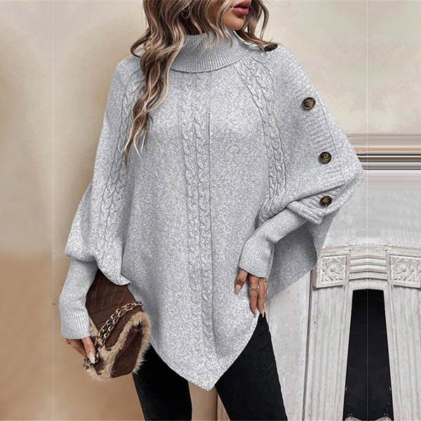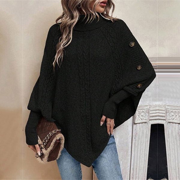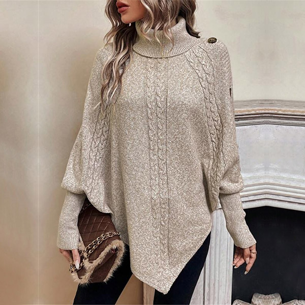 Fashion Turtleneck Buttoned Batwing Sleeve Irregular Hemline Cable Pattern Sweater