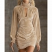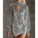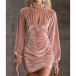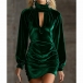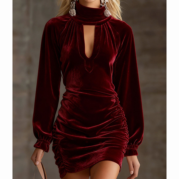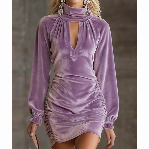 Fashion Turtleneck Front Cutout Long Sleeve Ruched Bodycon Velvet Dress