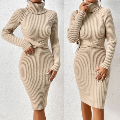 Fashion Turtleneck Long Sleeve Cross Ribbed Sweater Dress