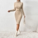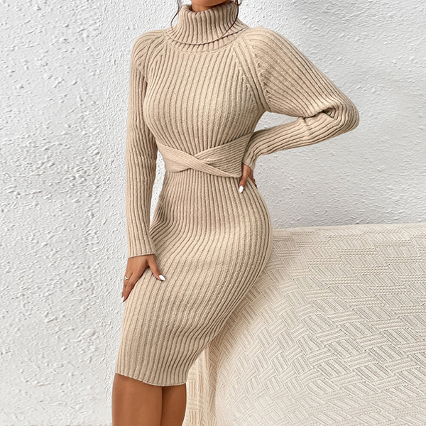 This knitted dress features elegant turtleneck styling with a cross design at the waist, comfortable long sleeves and ribbed detailing for contemporary cozy sophistication. Perfect for casual occasions, cozy styling, or sophisticated comfortable coordination.