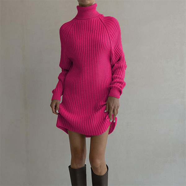 This sweater dress features classic turtleneck styling with structured ribbed construction and comfortable long sleeves for contemporary cozy elegance. Multi-colors available.