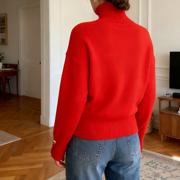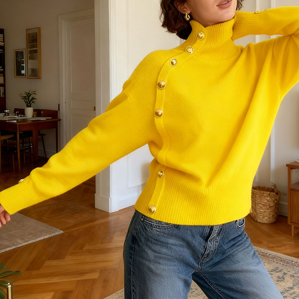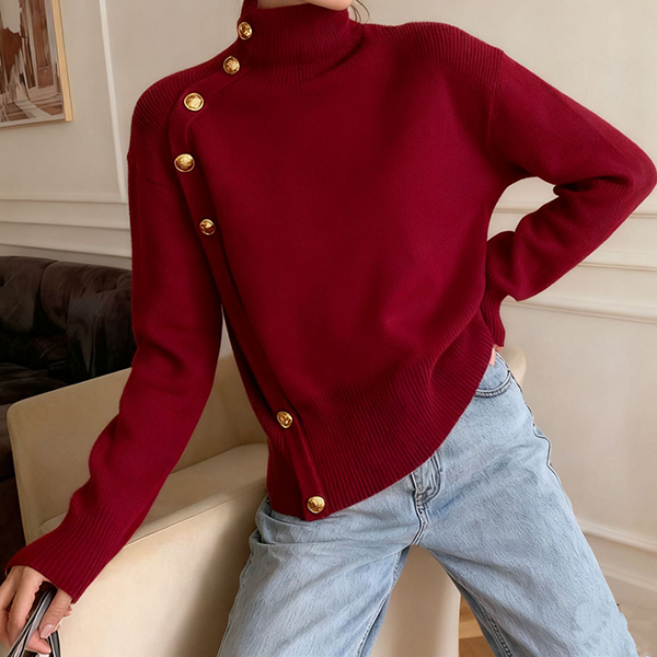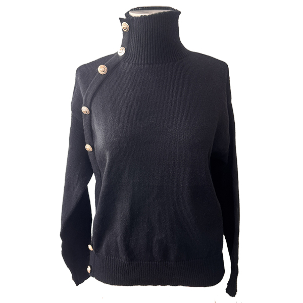 This sweater features refined turtleneck styling with contemporary side button decoration and comfortable knitted construction for modern elegant appeal. Pair with tailored bottoms and modern accessories for sophisticated contemporary appeal.