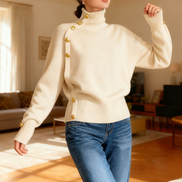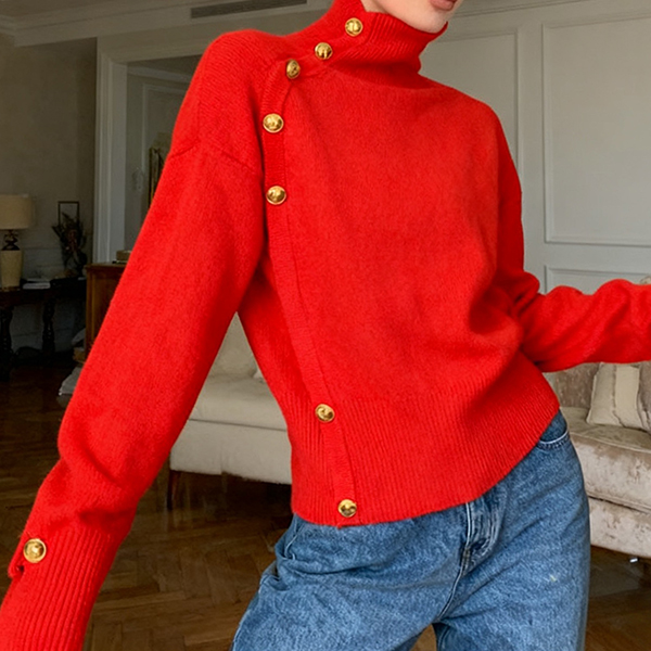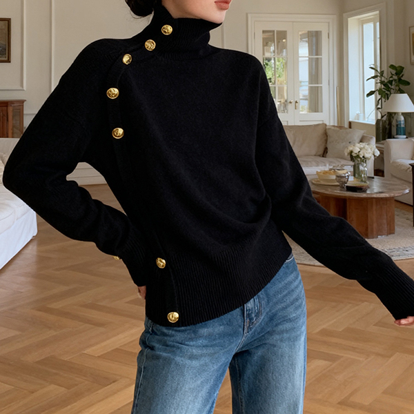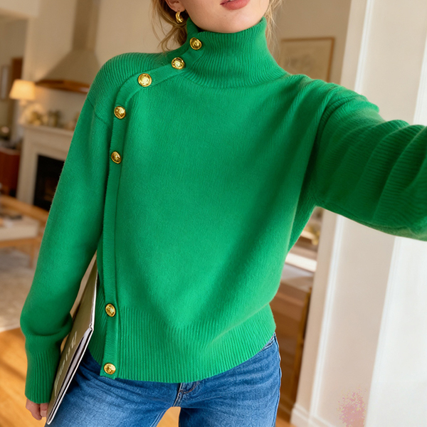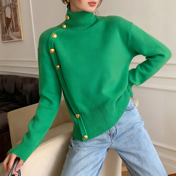 Fashion Turtleneck Long Sleeve Side Button Decoration Knitted Sweater