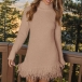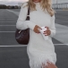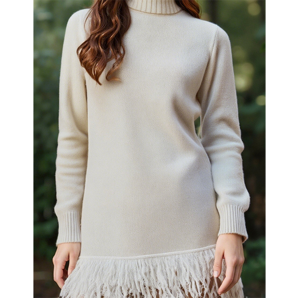 This contemporary sweater dress merges cozy comfort with dynamic finishing for sophisticated casual appeal. The turtleneck construction provides elegant neckline coverage and refined warmth that creates polished upper silhouette definition, while the long sleeves deliver comprehensive comfort with form-fitting coverage. The bodycon silhouette celebrates natural curves through stretchy knitted construction that moves with the body, and the tassel hemline introduces playful movement and textural contrast that transforms simple sweater dress styling into engaging statement pieces through deliberate finishing detail. Style it with boots for coordinated warmth.