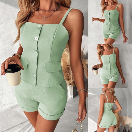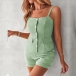 This is a stylish and versatile ensemble that combines a cami top and shorts for a chic and trendy look. The cami top features adjustable spaghetti straps for a customized and comfortable fit. The shorts offer a flattering and versatile style. Crafted with high-quality fabric, this two-piece set offers both comfort and style.