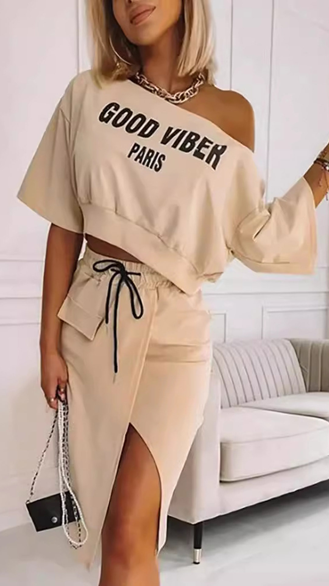 Fashion Two-piece Set Consist of Crop Shirt and Slit Skirt