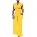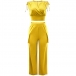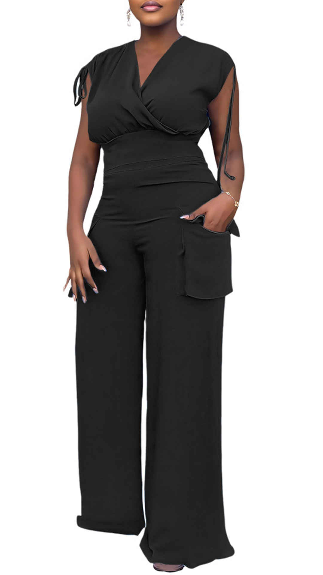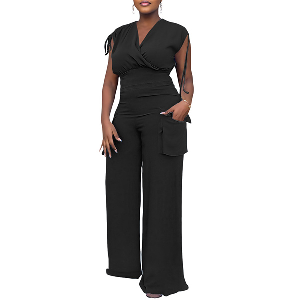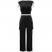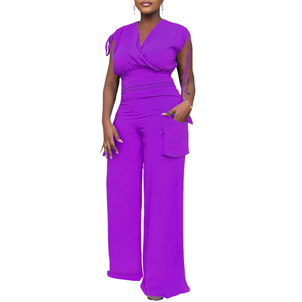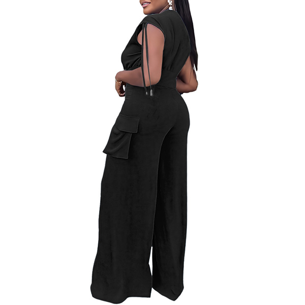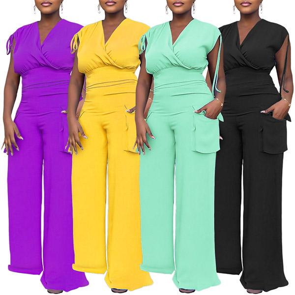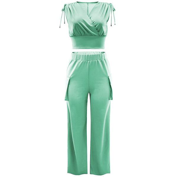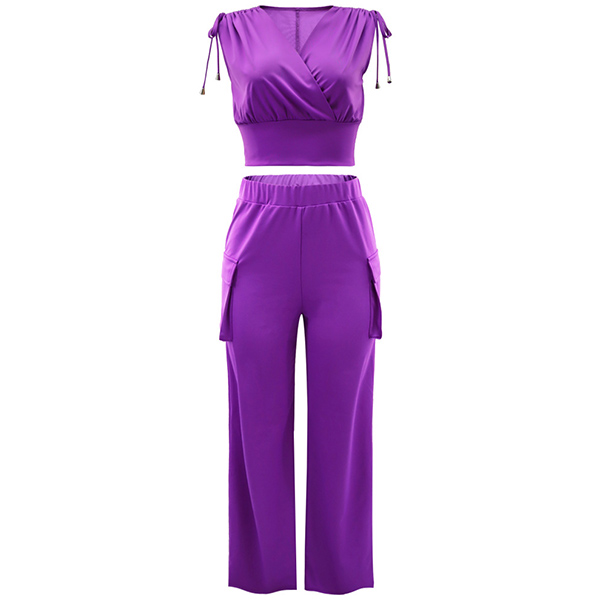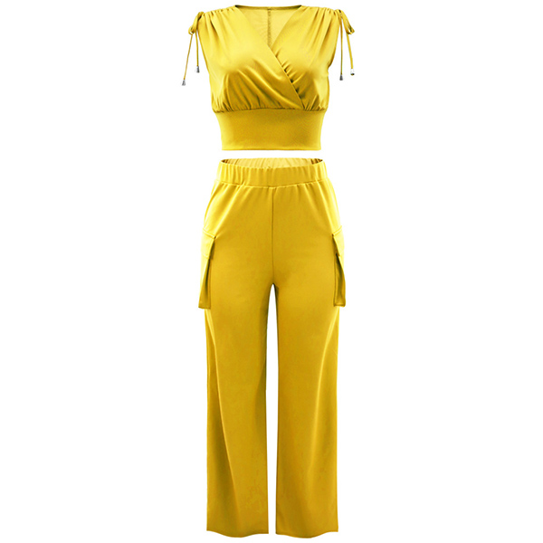 This fashionable two-piece set consist of a crop top and straight-cut pants, creating a trendy and stylish look. The crop top featurs drawstring design on the shoulder, which the pant features side patc pocket dedesign. This set is versatile and can be dressed up or down for various occasions. Wanna have a try?