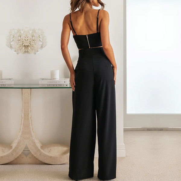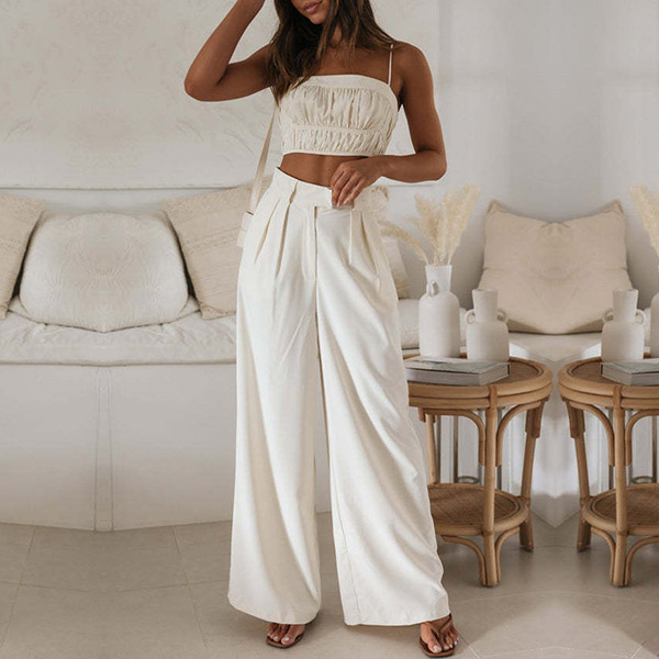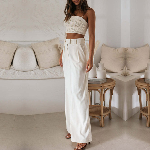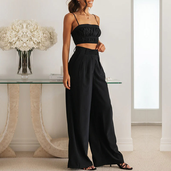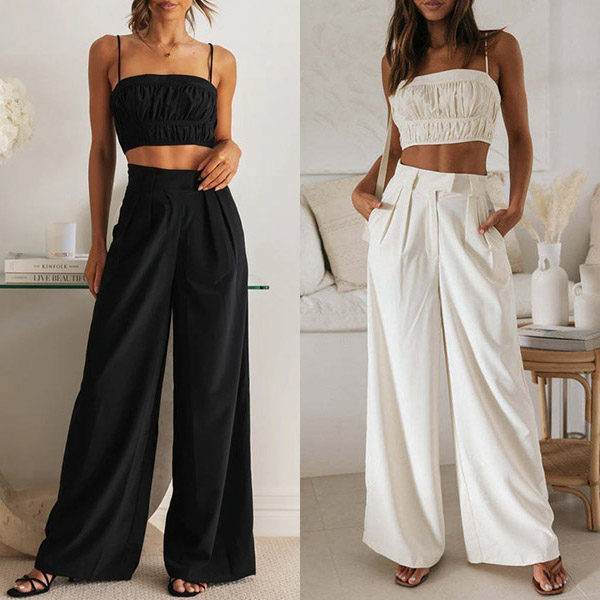 This fashion-forward two-piece set features a stylish crop top paired with a pair of chic, wide-leg pants, creating a cohesive and on-trend look. Black and white,which one do you like?