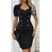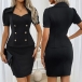 This set features a double-breasted shirt with matching skirt, creating a coordinated and chic look that is perfect for any occasion.